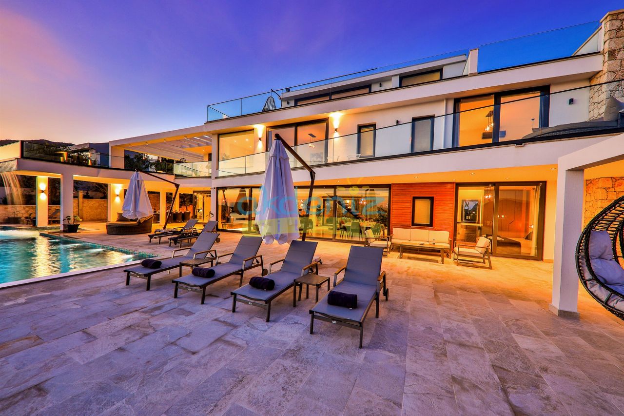 Kalamar bölgesindeki Villa Lavaya, 7 yatak odasıyla 14 kişiye kadar konaklama sunan, Kalkan’ın en iddialı villalarından biri. Üst katta geniş jakuzi ve serinleme havuzunun, alt kattaki büyük havuza şelale gibi akması hem görsel hem de deneyimsel bir keyif. Fitness alanı, sinema odası, bilardo ve masa tenisi ile “resort seviyesinde” bir tatil yaşatır. Tüm odalarda ses sistemi ve deniz manzaralı geniş teras, kalabalık gruplar için kusursuz bir ortam sağlar. Ultra lüks arayan geniş aileler ya da arkadaş grupları için birebirdir.
